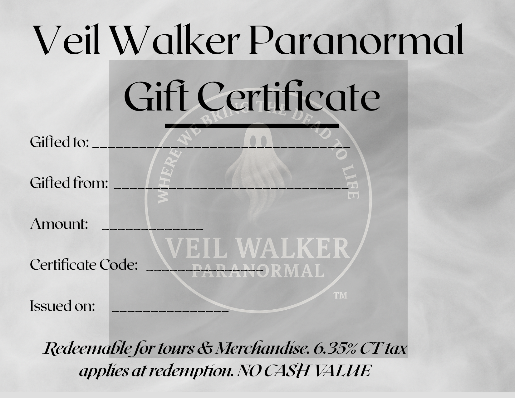 Give the gift of the paranormal! Veil Walker Paranormal gift certificates can be purchased for $50, $75 or $100 and used toward tour bookings or merchandise.